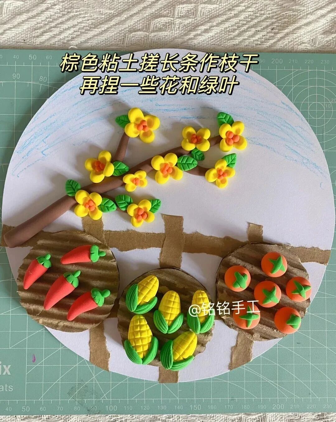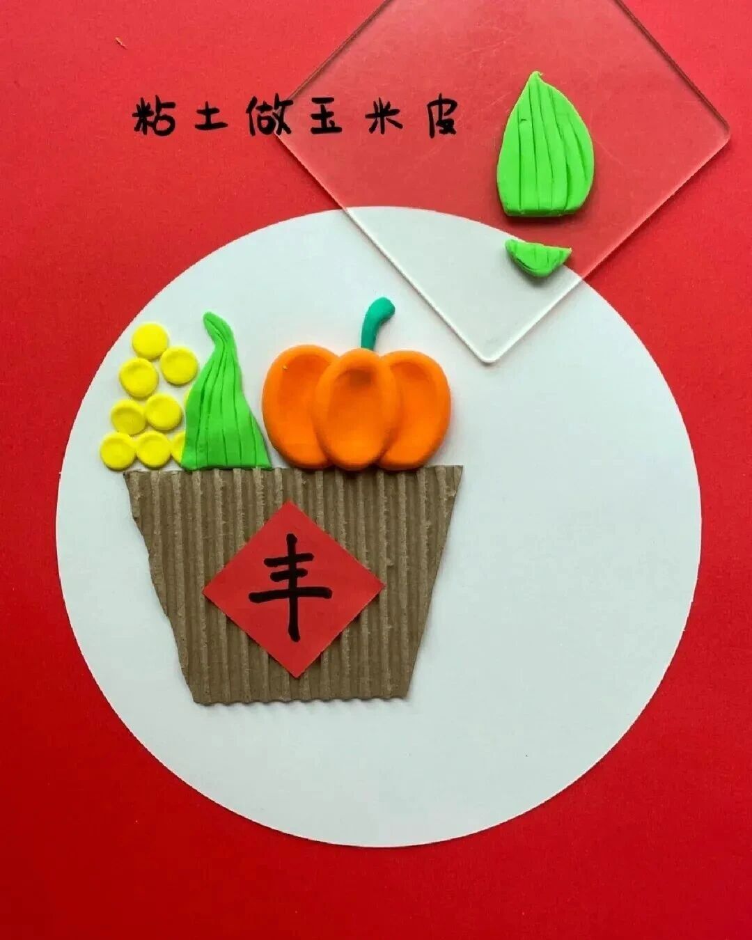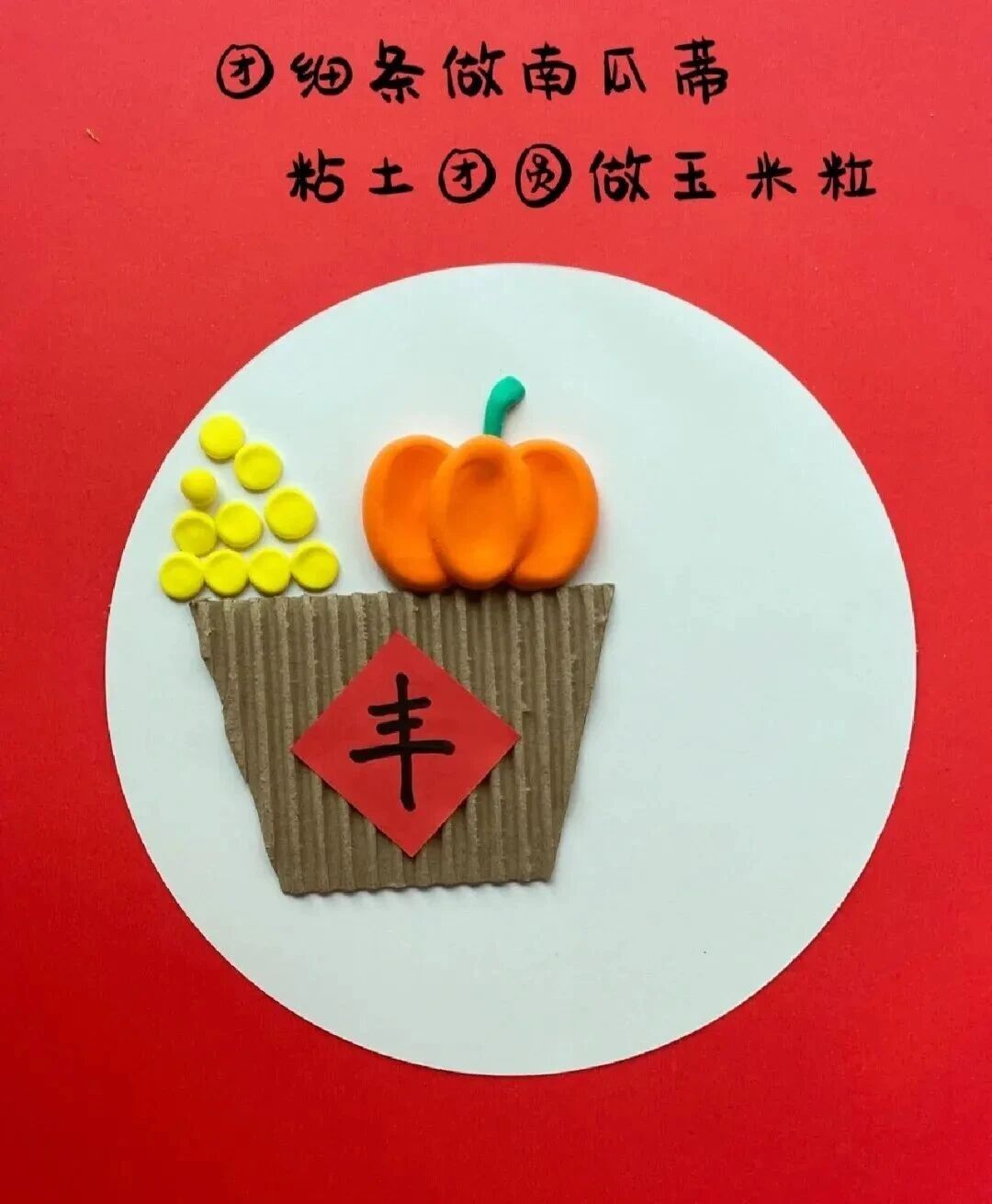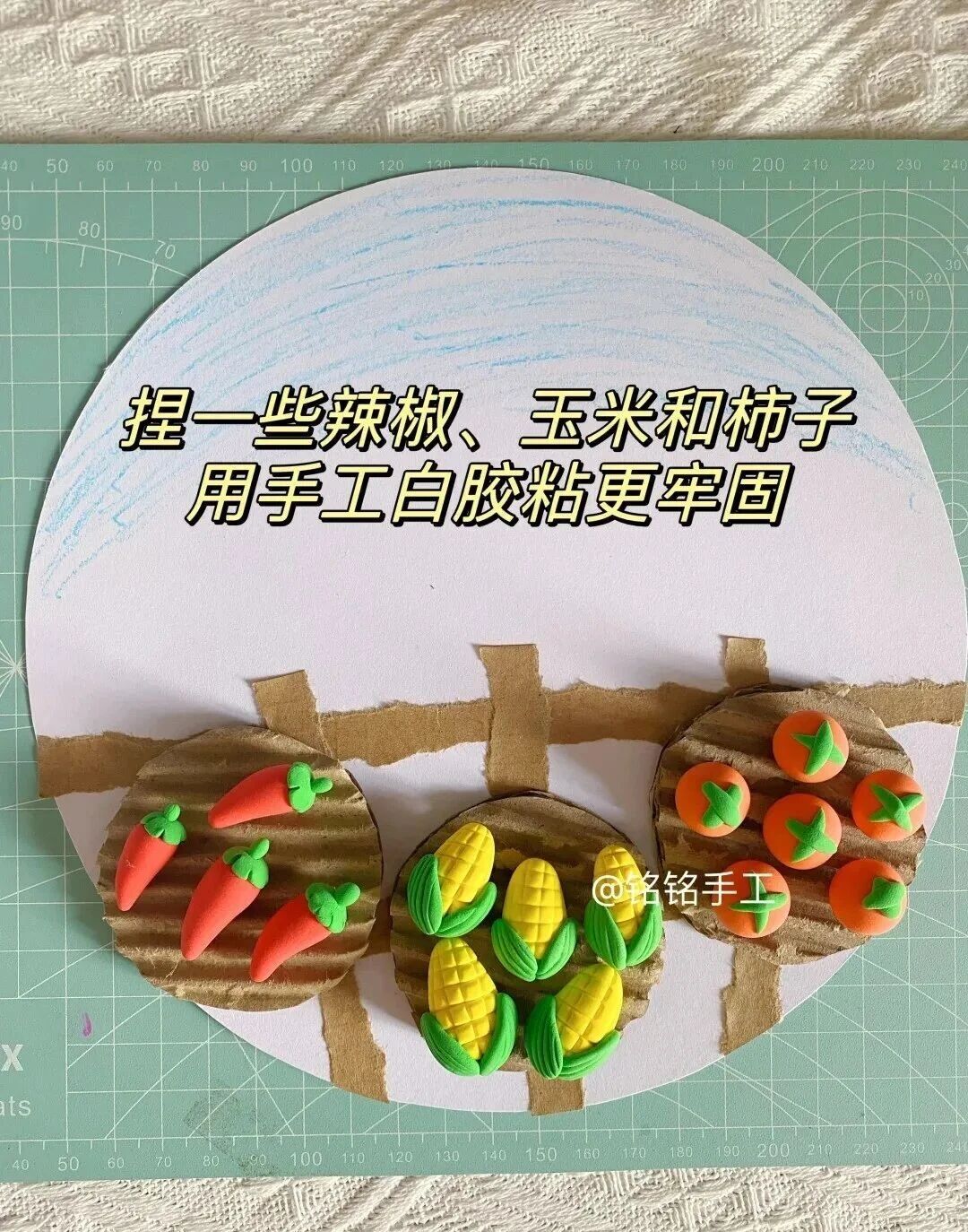 准备材料:圆形卡纸、水粉颜料、粘土、彩纸边角料、水果网。