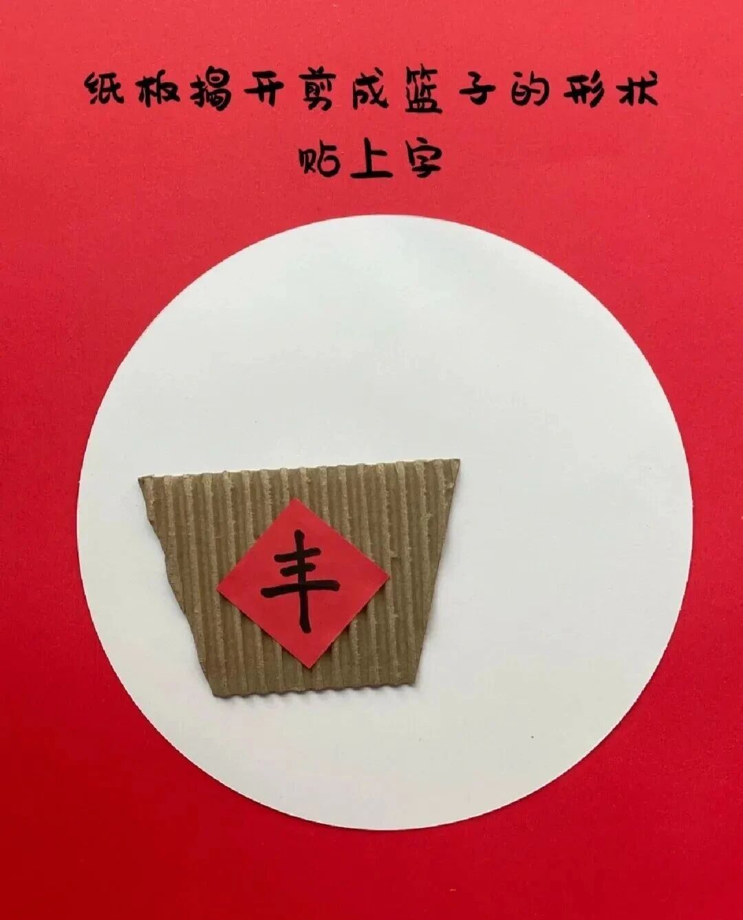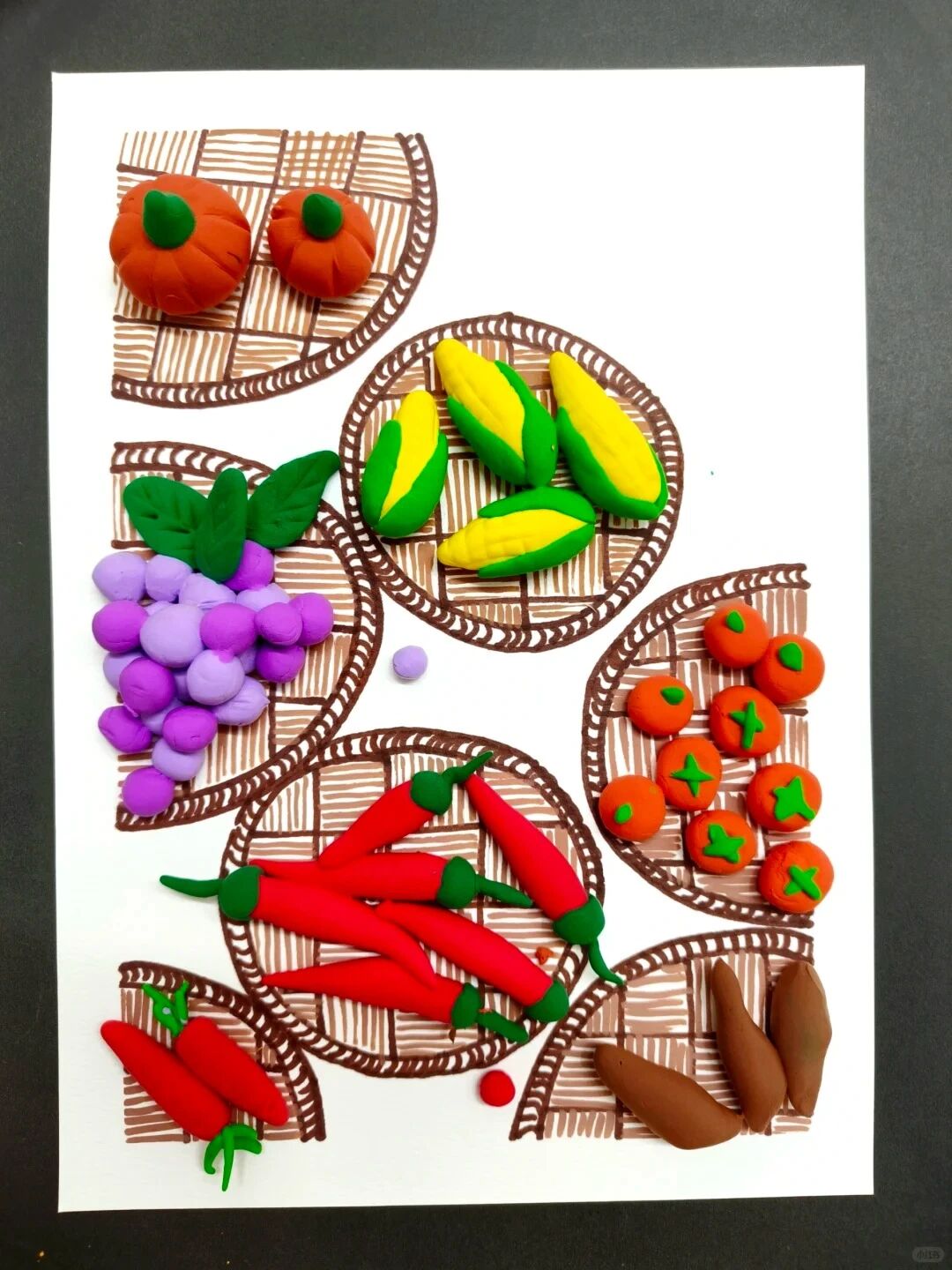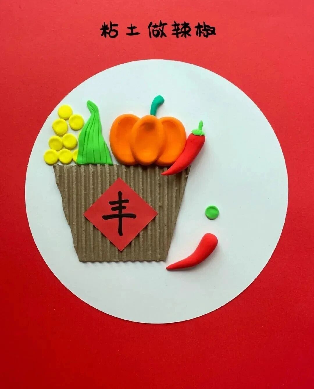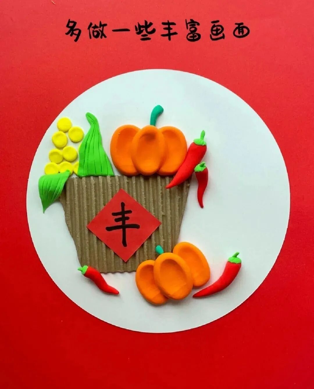准备材料:圆形卡纸、水粉颜料、粘土、彩纸边角料、水果网。