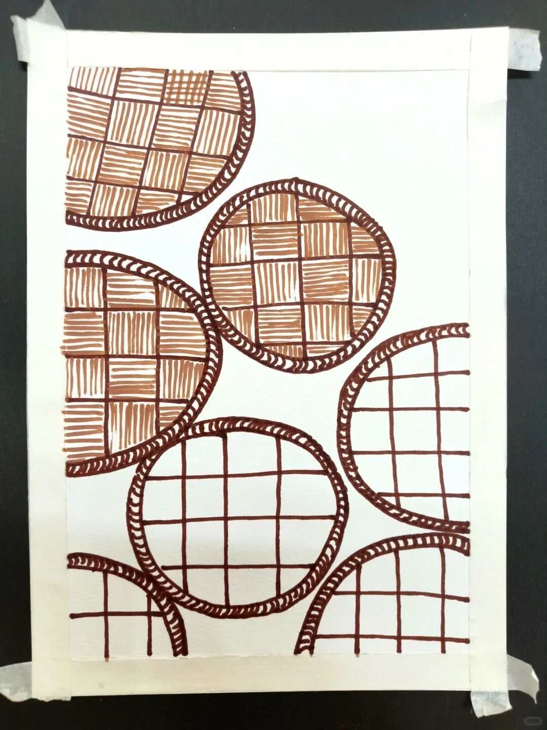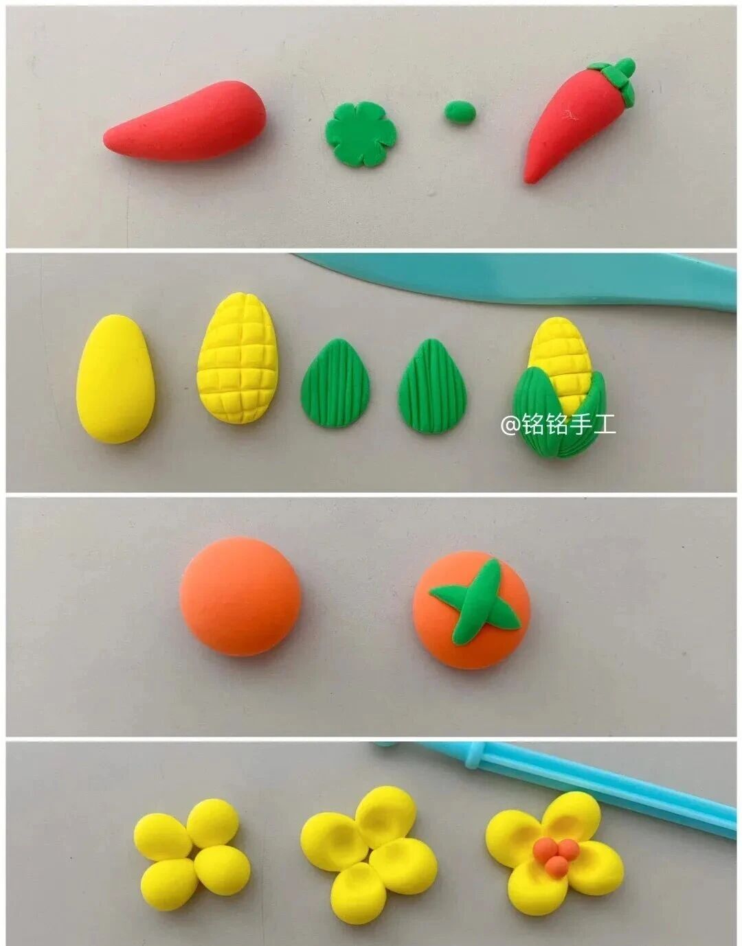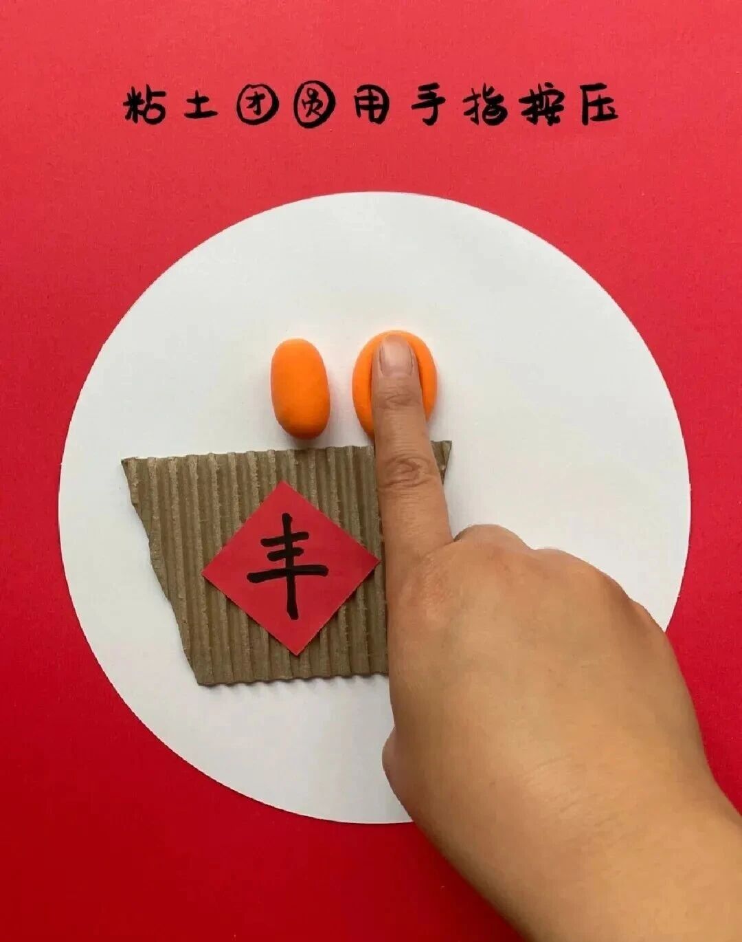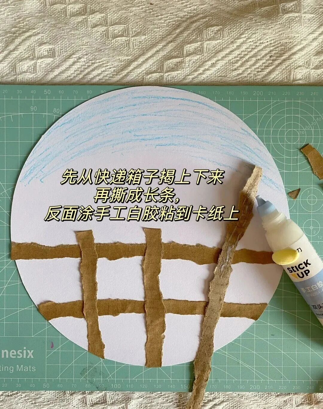 准备材料:圆形卡纸、水粉颜料、粘土、彩纸边角料、水果网。