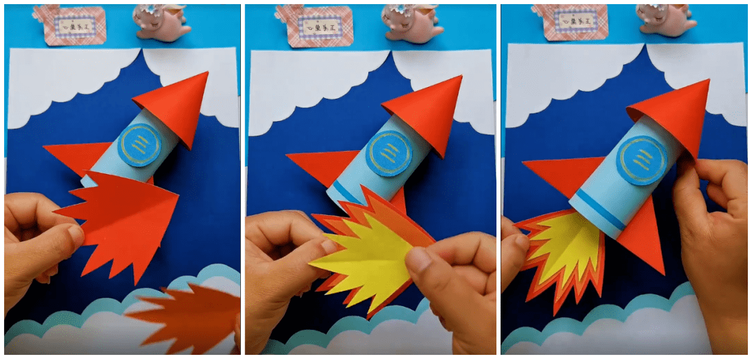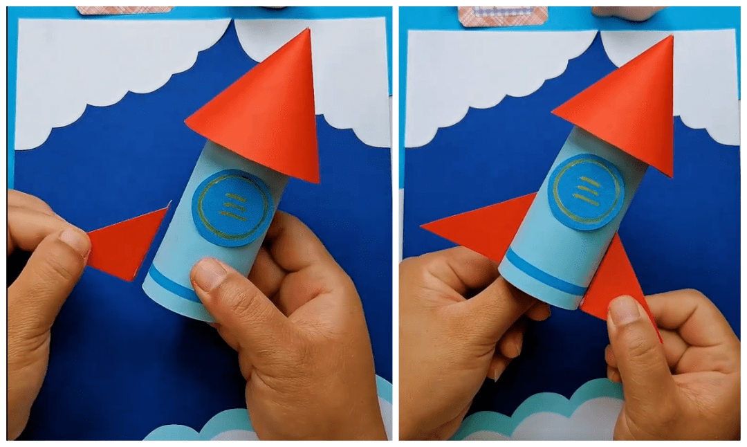 ● 在火箭两侧粘上小翅膀,在尾部粘贴上火焰,最后在两边画上装饰星星,神气的小火箭就完成啦~