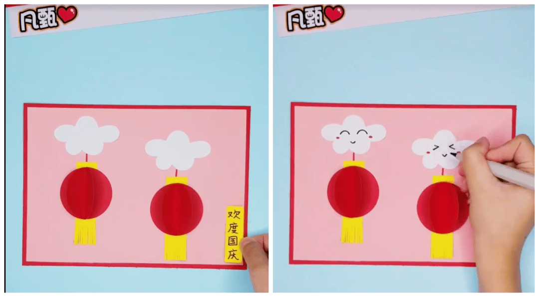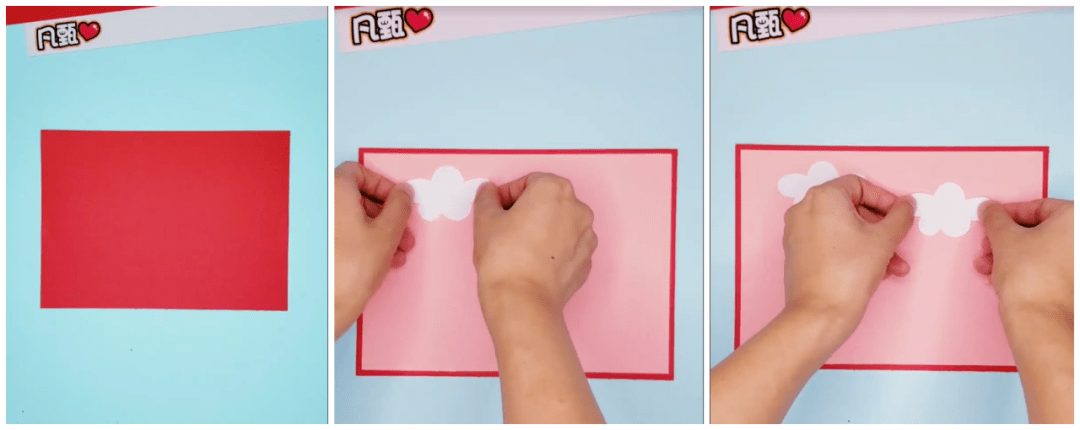 ● 在红色背景纸板上如下图贴上白色小云朵: