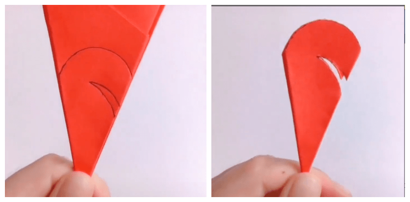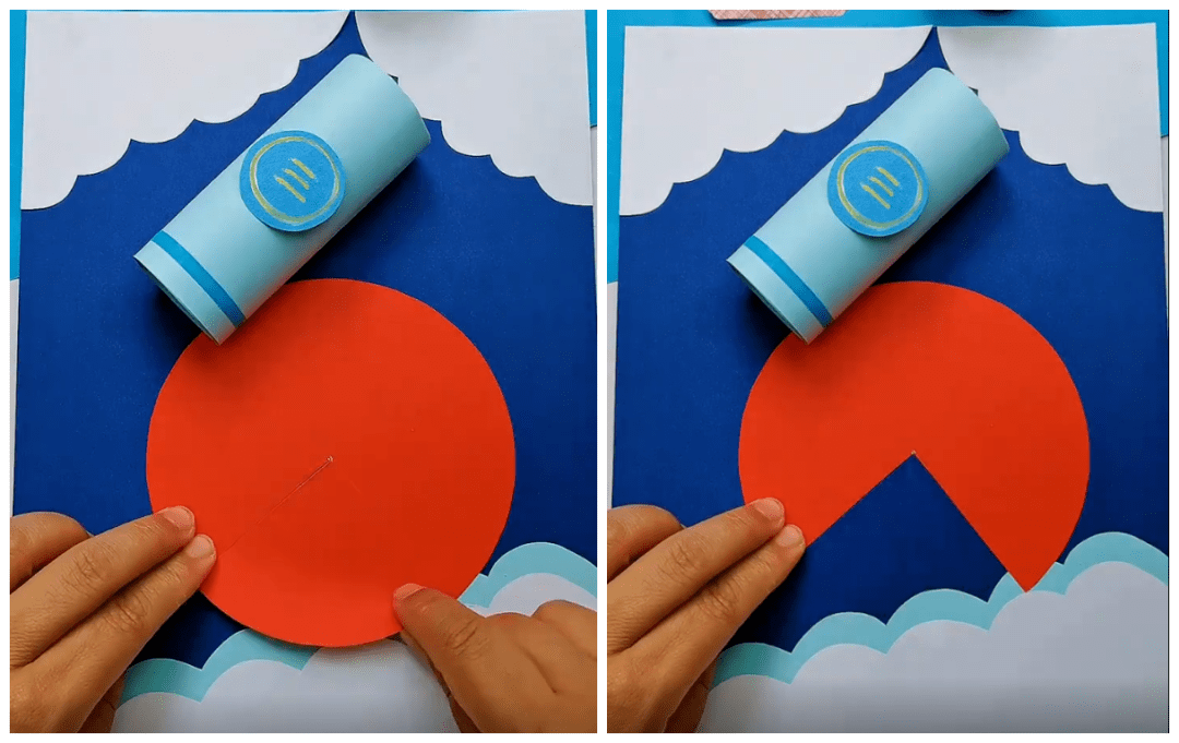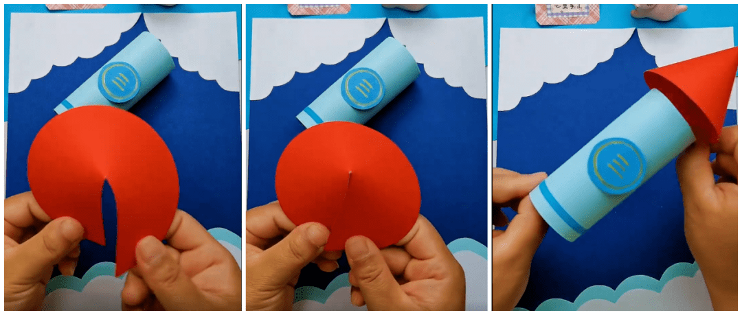 ● 红色圆形卡纸裁剪四分之一出来,剩下的部分如下图对着做火箭的顶部: