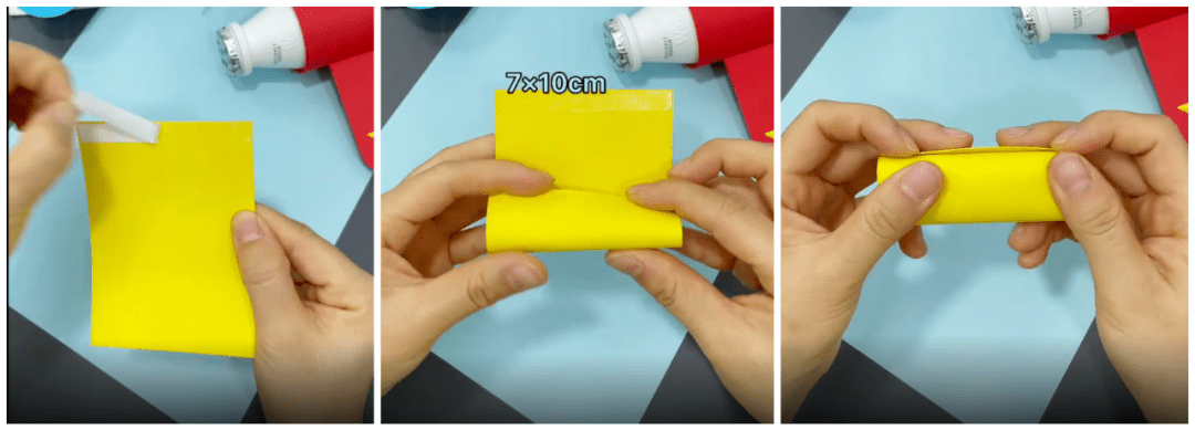 ● 用黄色的小长方形卡纸卷起来,在一头贴上双面胶,卷好固定起来。然后粘在飞机翅膀下面: