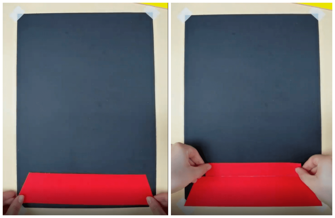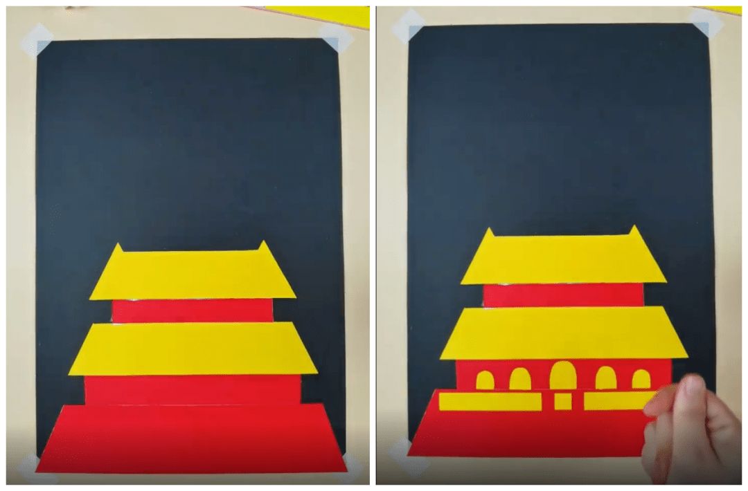 ● 将红色、黄色卡纸如下图一层层垒在黑色背景卡纸底部,搭建出天安门的雏形: