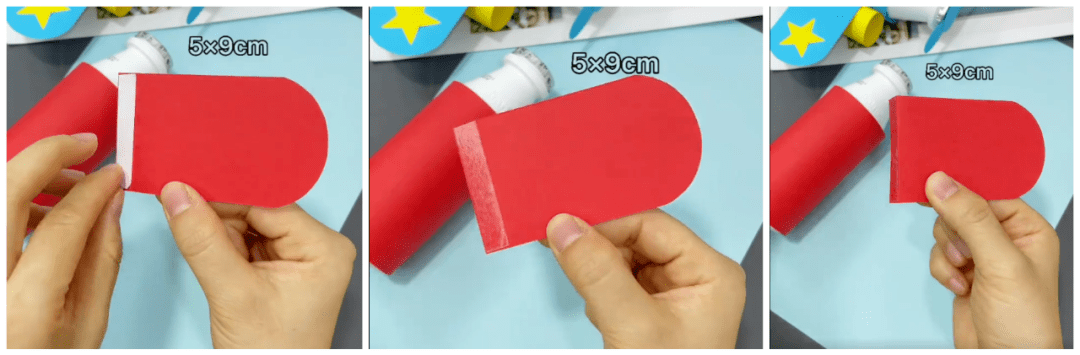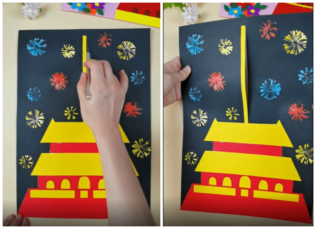 ● 在旗杆的缝隙中塞入长方形红色卡纸条,露出一部分,贴上五角星贴纸,另一部分隐藏在卡纸后面: