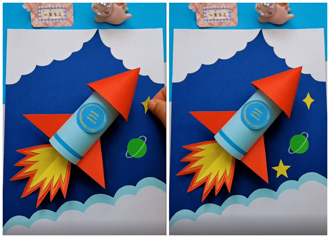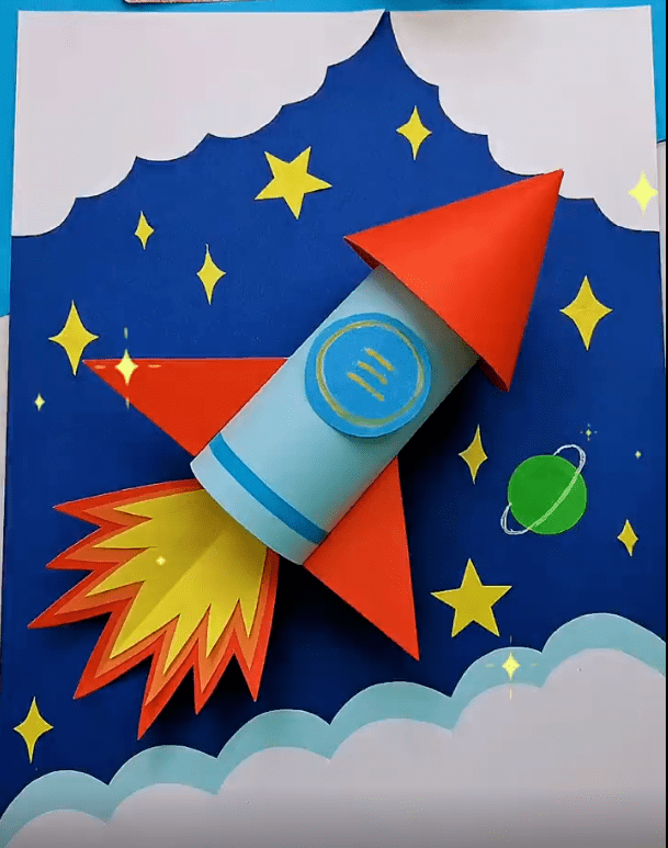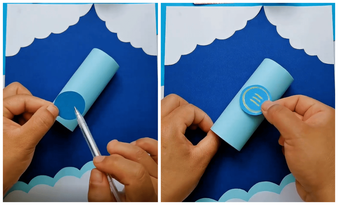 ● 将卷成圆筒形状的蓝色卡纸当做火箭身体,如下图粘贴在背景纸上,并贴上中心的圆形标志: