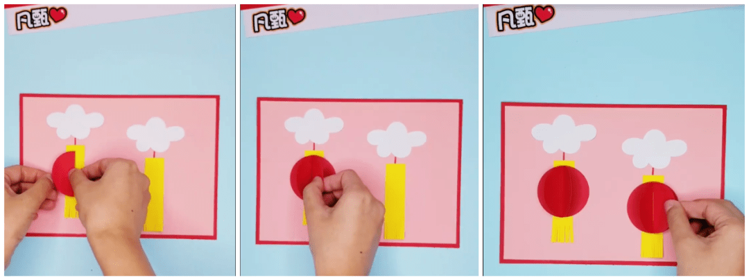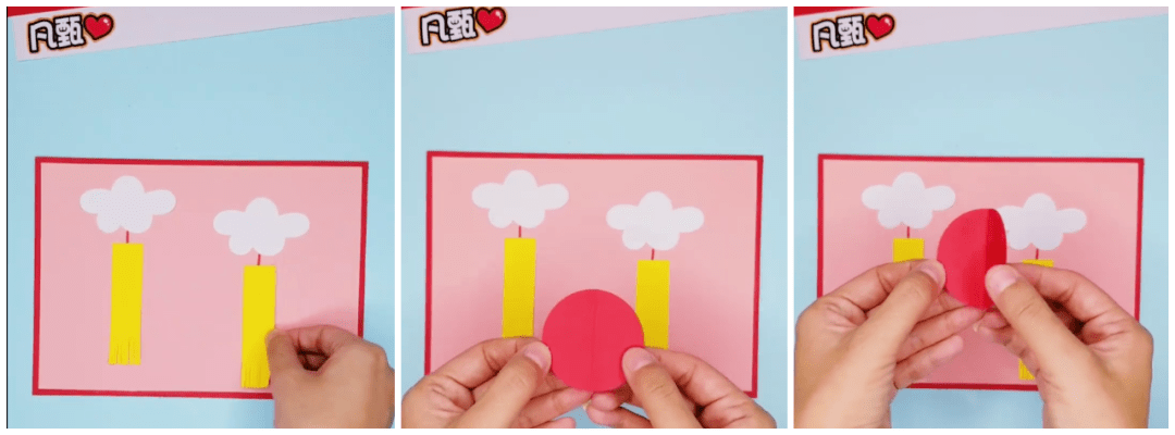 ● 将圆形的红色卡纸对折,如下图制作两个,对贴在一起,粘贴在黄色流苏中部: