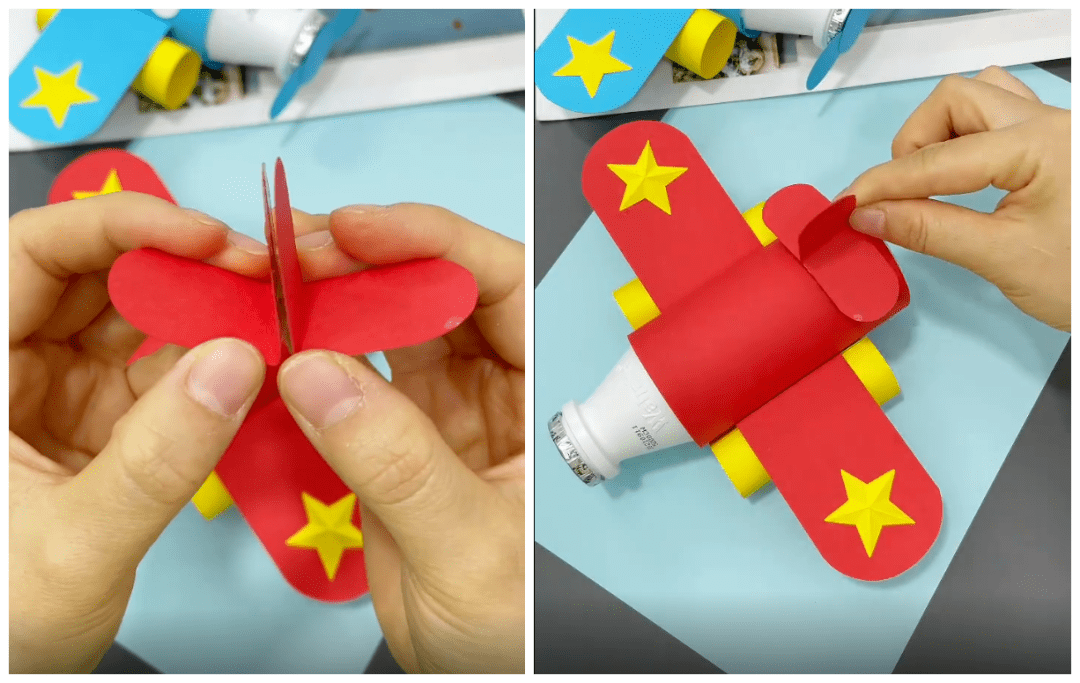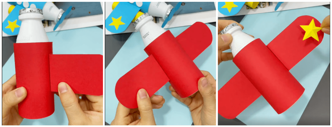 ● 将小飞机的两个翅膀如下图固定在机身上,两边各贴一个五角星做装饰: