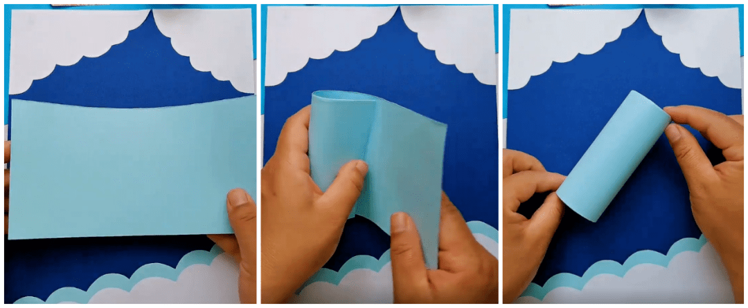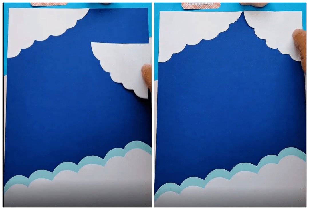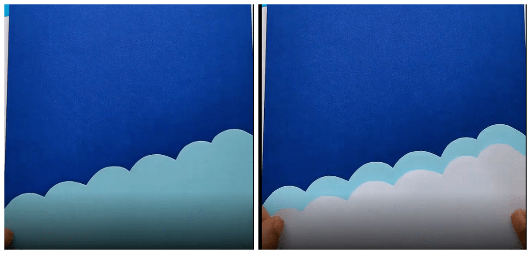 ● 如下图将白色和蓝色纸制作出的云边形状贴在蓝色背景纸上: