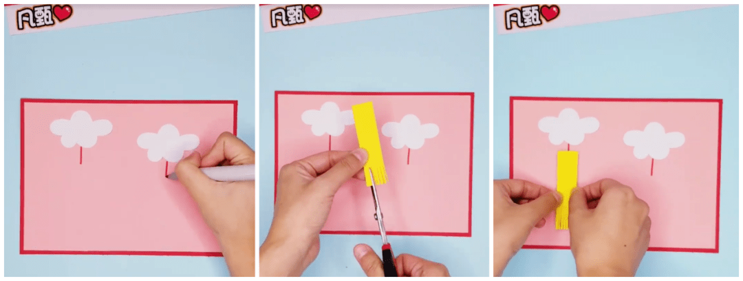● 将黄色长方形卡纸条尾部用剪刀剪出一条条的流苏(注意不要剪断哦)并在云朵下方用红色画笔画出一小截竖道: